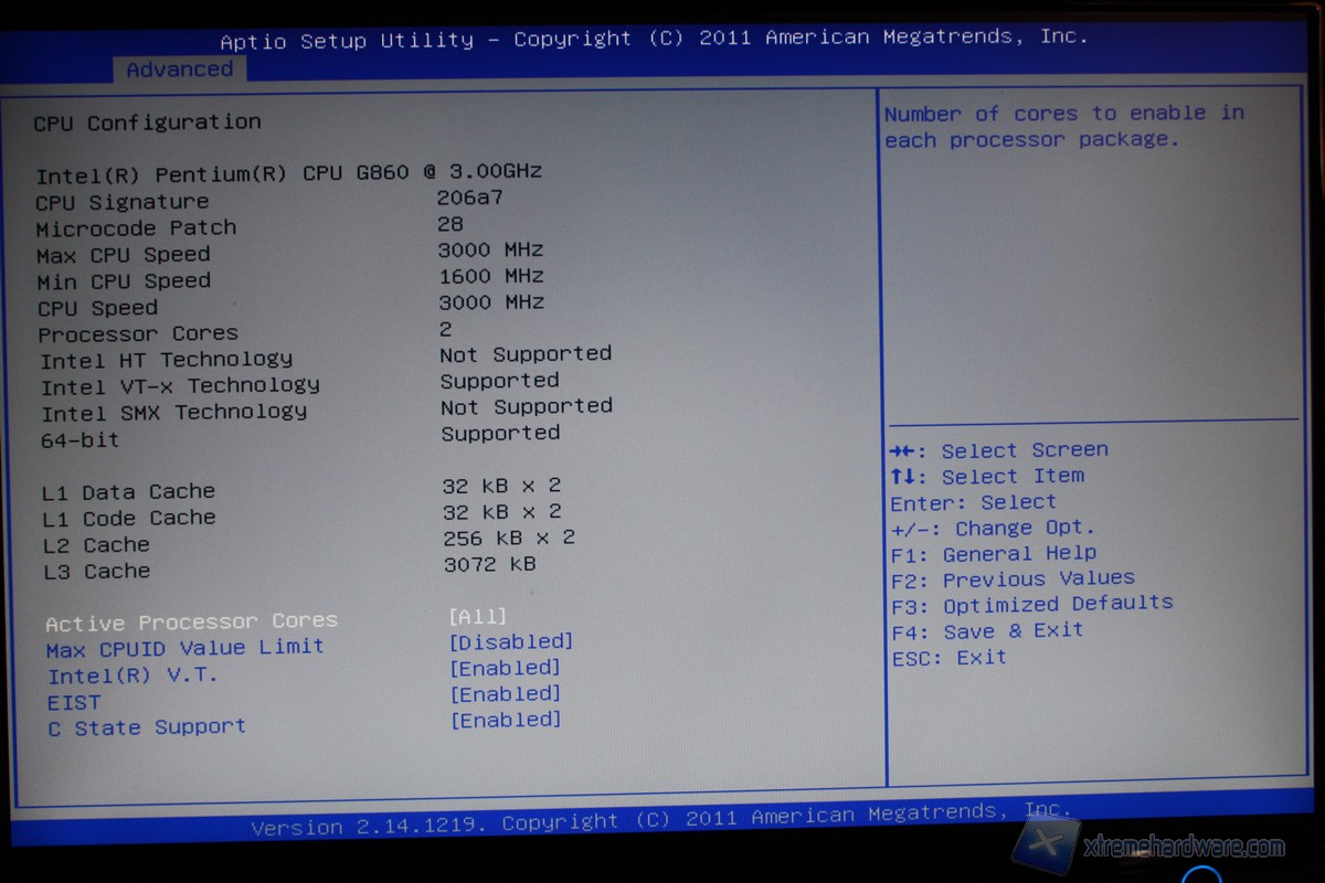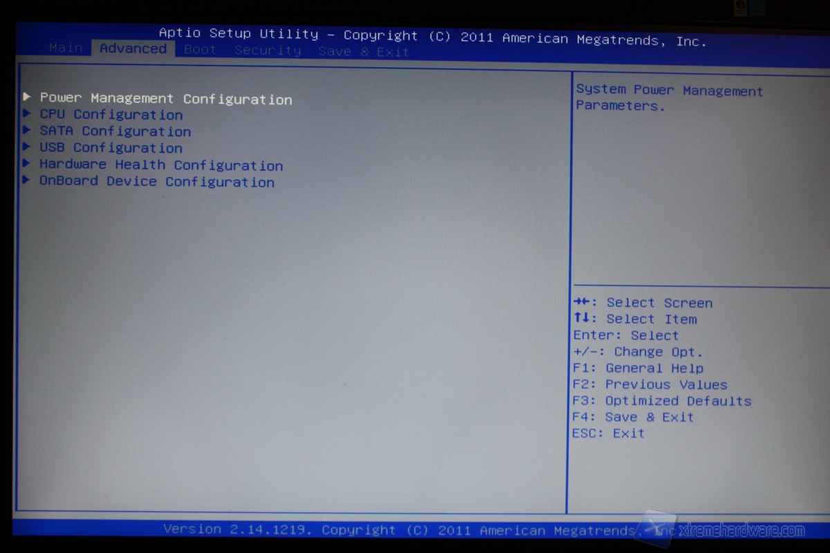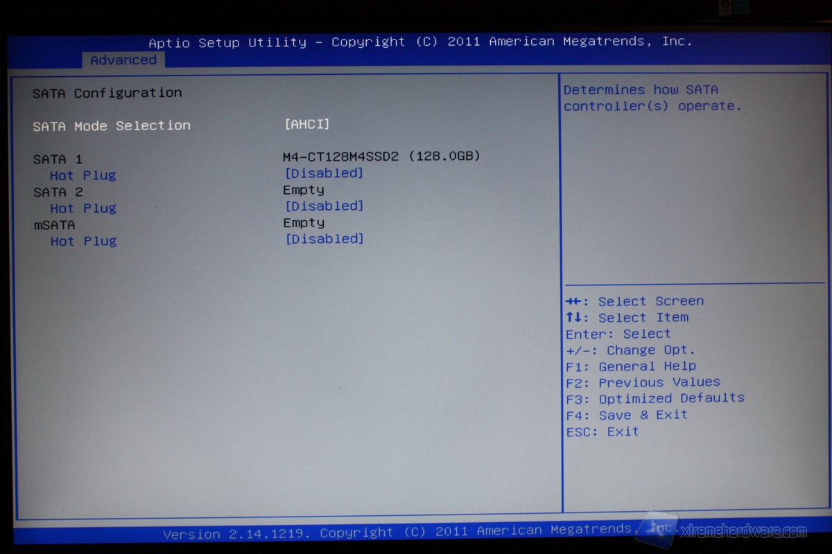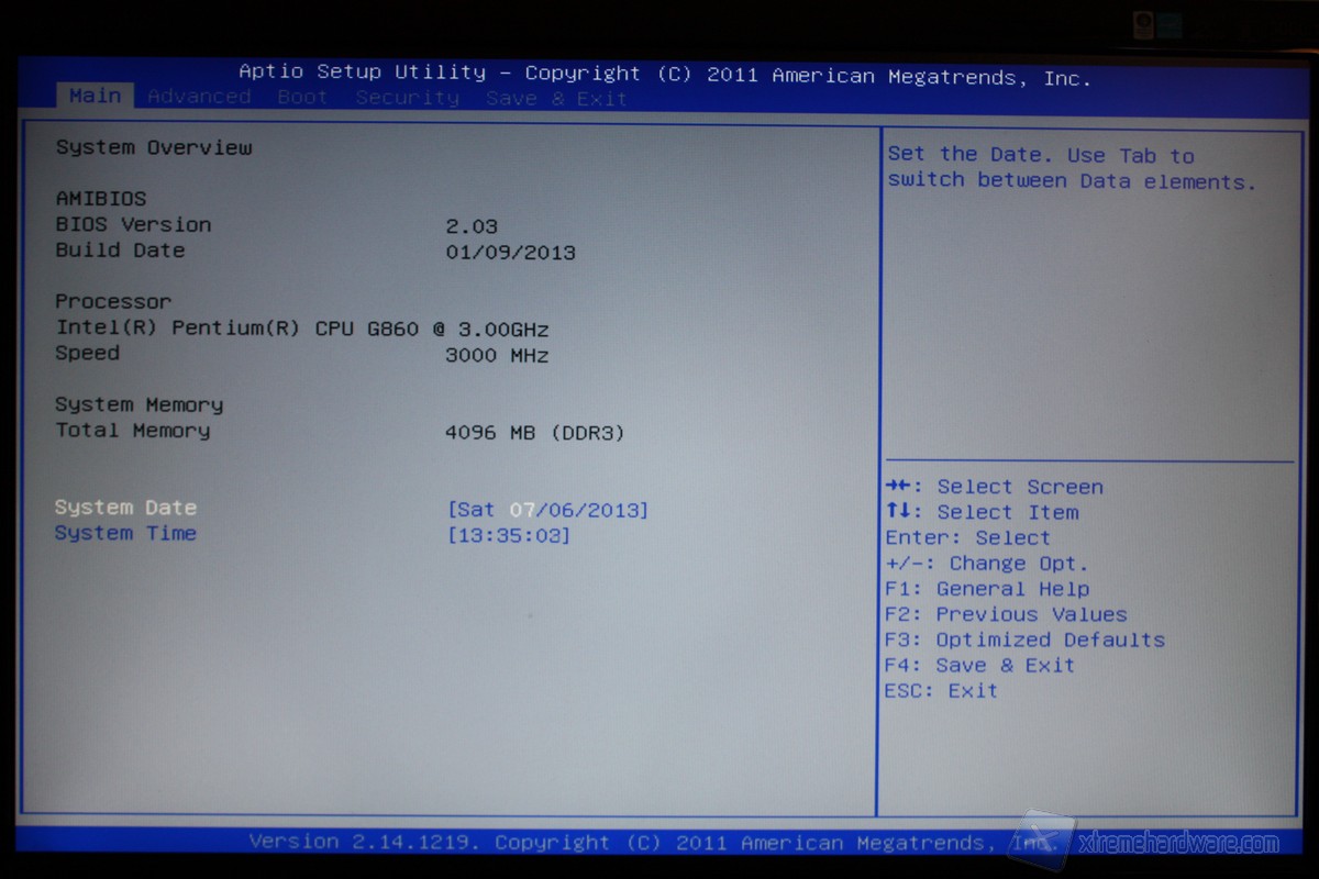 Il BIOS si compone di cinque menù che sono Main, Advanced, Boot, Security e Save & Exit. Il primo menù è facilmente raggiungibile premendo il tasto CANC o F2. In questo menù troviamo le informazioni base come versione del BIOS installato, informazioni sul processore, quantitativo di memoria RAM installata e l’ora e la data, quest’ultimi ovviamente modificabili.